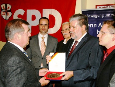 Andernach. Auf Vorschlag des Andernacher SPD-Stadtverstandes erhielt Herbert Becker aus den Händen des SPD-Landesvorsitzenden, Ministerpräsident Kurt Beck und Peter Wilhelm Dröscher, MdL, die Wilhelm-Dröscher-Plakette. Der Ministerpräsident und SPD-Landesvorsitzender nahm die Ehrung auf dem 100. SPD-Rentnerstammtisch in Beckers Heimatstadt Andernach persönlich vor. Die Auszeichnung wird verliehen für herausragendes Engagement, das den Geist des politischen Wirkens von Wilhelm Dröscher weiter trägt.