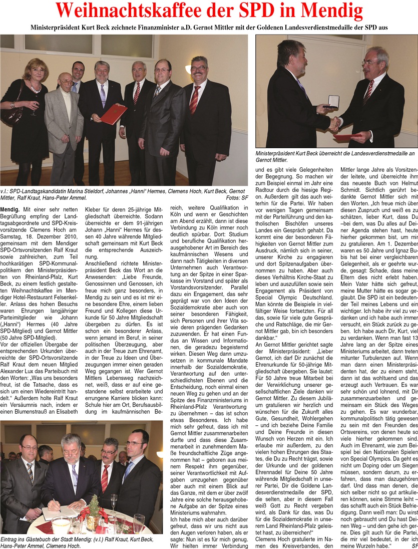 Mendig. Mit einer sehr netten Begrüßung empfing der Landtagsabgeordnete und SPD-Kreisvorsitzende Clemens Hoch am Samstag, 18. Dezember 2010, gemeinsam mit dem Mendiger SPD-Ortsvorsitzenden Ralf Kraut sowie zahlreichen, zum Teil hochkarätigen SPD-Kommunalpolitikern den Ministerpräsidenten von Rheinland-Pfalz, Kurt Beck, zu einem festlich gestalteten Weihnachtskaffee im Mendiger Hotel-Restaurant Felsenkeller. Anlass des hohen Besuchs waren Ehrungen langjähriger Parteimitglieder wie Johann („Hanni“) Hermes (40 Jahre SPD-Mitglied) und Gernot Mittler (50 Jahre SPD-Mitglied).