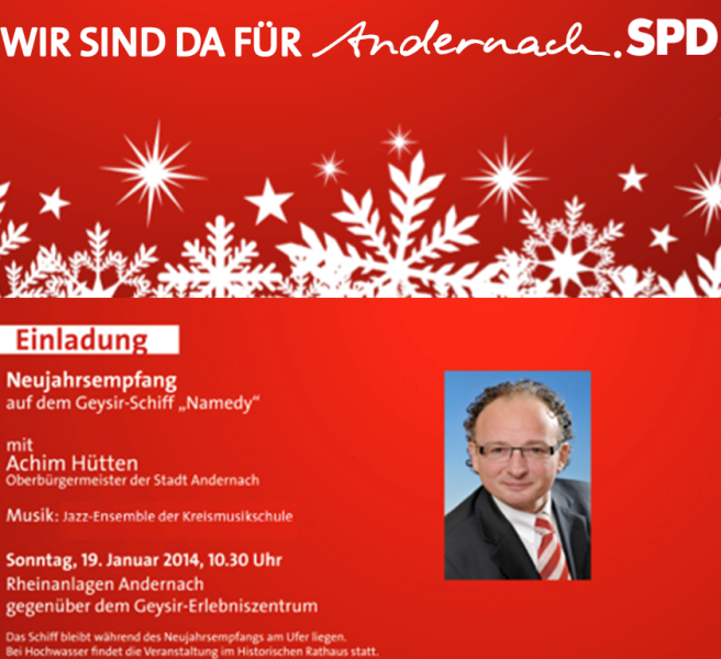 Andernach. „Ein gutes und gesundes neues Jahr wünschen wir allen Andernacherinnen und Andernachern und laden alle interessierten Bürgerinnen und Bürger herzlich zu unserem Neujahrsempfang 2014 ein", so der Andernacher SPD-Stadtverbandsvorsitzende Marc Ruland, MdL.