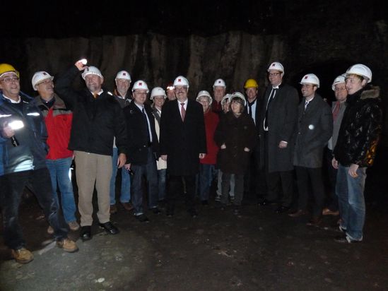Staatssekretär Schweitzer nahm Gesprächsangebot und Einladung zum Ortstermin mit Prof. Dr. Harald Ehses und Dr. Michael Rogall vom Landesamt für Geologie und Bergbau gerne an. Gemeinsam mit Hoch steigen SPD Stadtratsmitglieder, Stadtbürgermeister Hans Peter Ammel und Bürgermeister Jörg Lempertz hinab in die rund 32 Meter tiefen Besucherstollen des ehemaligen Bergwerkes.