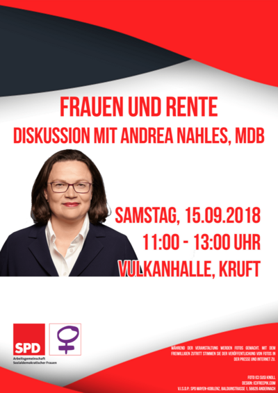 Auf Einladung der Arbeitsgemeinschaftsozialer Frauen des Kreises Mayen-Koblenz (AsF MYK) nimmt Andrea Nahles, MdB an der Diskussionsrunde zum Thema „Frauen und Rente“ am Samstag, den 15.09.2018 von 11 bis 13 Uhr in der Vulkanhalle in Kruft teil. Wie können sich Frauen gegen die drohende Altersarmut rechtzeitig absichern? Wie sieht frauenfreundliche Rentenpolitik aus? Über diese und viele weiteren Fragen zu dem Thema möchten wir mit Ihnen diskutieren und anschließend die Veranstaltung bei einem kleinen Imbiss und gemütlichen Beisammensein ausklingen lassen. Alle interessierten Frauen sind herzlich eingeladen. Natürlich sind auch männliche Diskussionsteilnehmer herzlich willkommen.