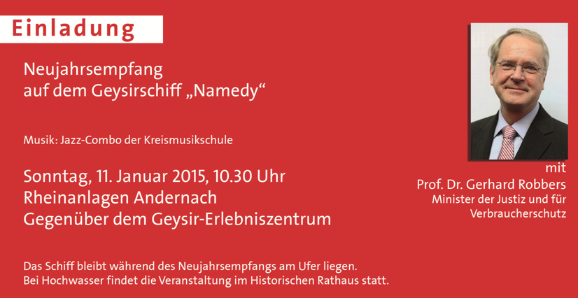 Der Empfang der Andernacher Sozialdemokratie beginnt am Sonntag, 11. Januar 2015, um 10.30 Uhr. Auch in diesem Jahr wird der SPD-Jahresauftakt auf dem Geysirschiff „Namedy“ stattfinden. Dieses wird während des Empfangs am Geysir-Anleger gegenüber dem Geysir-Infozentrum (Konrad-Adenauer-Allee 40) liegen bleiben. Sollte es zu einem Hochwasser kommen, wird der Empfang im historischen Rathaus (Hochstraße Ecke Kramgasse) stattfinden.