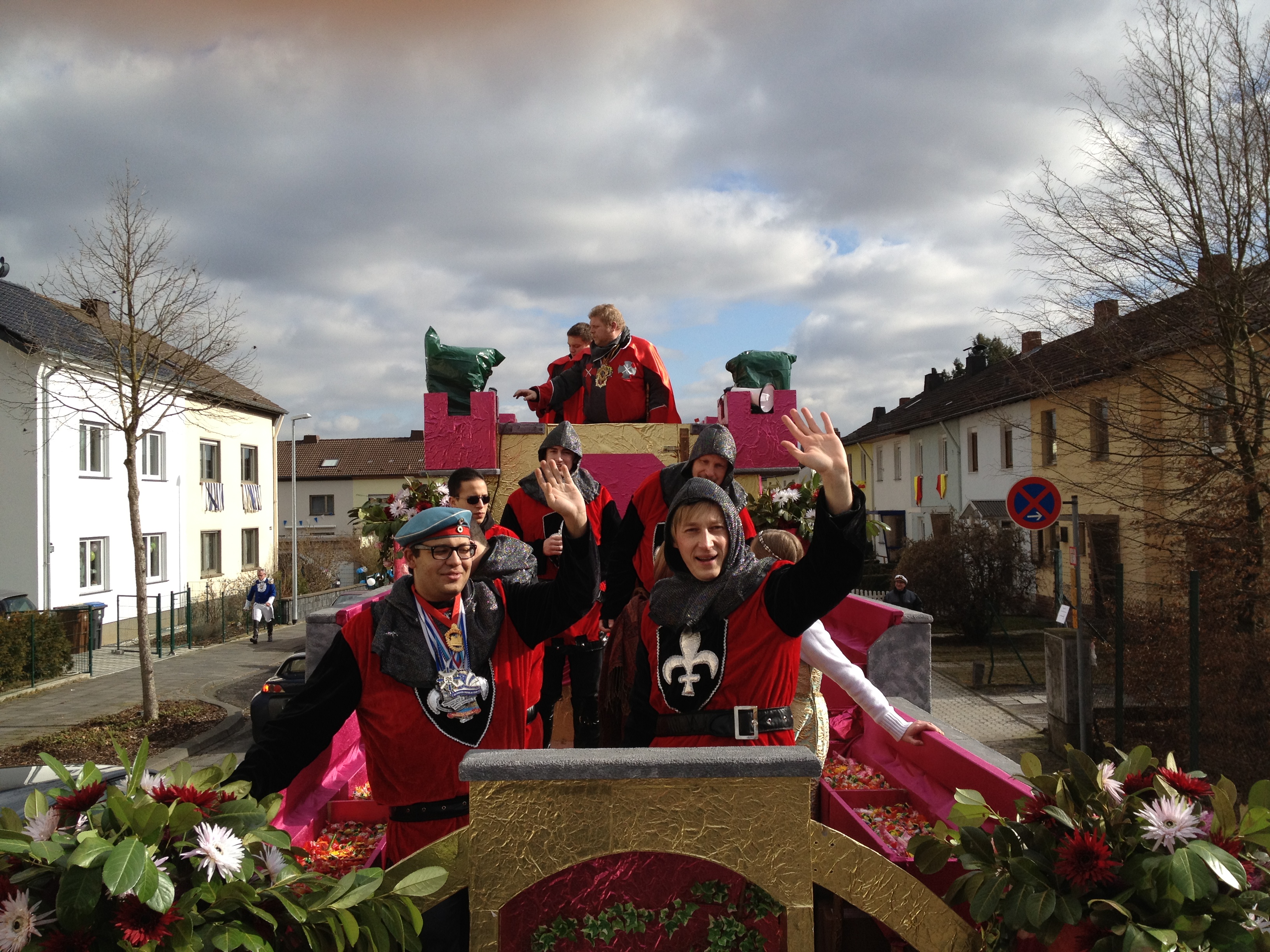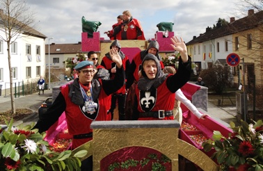 „Unter dem Motto: „Rote Ritter“ nahmen die Jusos der SPD mit ihrem Prunkwagen im diesjährigen Rosenmontagsumzug zu Ehren von Prinz Raphael I., der Soldat im Prin-zenornat", und Prinzessin Gabi III. „Die Schnabbelschnüss aus der Nauzebütt", teil.