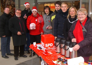 Andernach. Nikolausaktion der Andernacher Sozialdemokraten auf dem Stadthausplatz. Bei wärmenden Glühwein und Schokonikoläuse für die Kleinen wurden die Sozialdemokraten auf die Beratungen des städtischen Haushalts, die Stadtentwicklung und insbesondere tagesaktuelle Themen - wie die EU-Schuldenkrise und die Debatte um einen gesetzlichen Mindestlohn - von den Bürgerinnen und Bürger angesprochen.