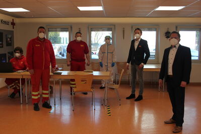 Marc Ruland staunte nicht schlecht, als er hörte, dass die ehrenamtlichen Helfer des DRK-Stadtverbands, der örtlichen DLRG und der Freiwilligen Feuerwehr mit vereinten Kräften wöchentlich bis zu 400 PoC-Antigen Schnelltests zur Testung auf SARS-CoV-2 durchführen. Im Andernacher Corona-Schnelltestzentrum ließ sich der SPD-Landtagsabgeordnete von Lars Hörnig, Vorstandsvorsitzender des DRK Ortsvereins Andernach e.V., und Erik Müller, 1. Vorsitzender DLRG Ortsgruppe Andernach e.V., erklären, wie ein typischer Testnachmittag in der Karolingerstraße abläuft.