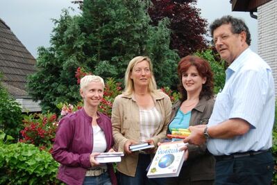 Sie überreichten gemeinsam mit der Ortsbeiratskandidatin Kirsten Schmitz, die maßgeblich an der Einrichtung einer Bücherei in der Grundschule beteiligt war, eine Bücherspende an Sabine Kirchem, Vorsitzende des Fördervereins der Grundschule.