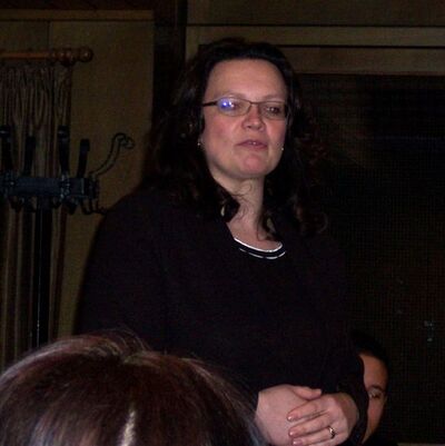 Die stellvertretende Bundesvorsitzende und Kreisvorsitzende Andrea Nahles (MdB) hielt eine bewegende Rede über die Werte, die die SPD in ihrer langen Geschichte bewahrt hat und sprach dann über ihre unmittelbar bevorstehende Reise zur Unterstützung einer israelisch-palästinensischen Begegnungsstätte in Jerusalem.