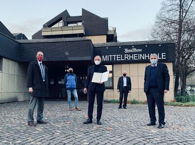 Gute Nachrichten aus der Landeshauptstadt Mainz hatte Staatssekretär Clemens Hoch im Gepäck. Er konnte in Vertretung von Innenminister Roger Lewentz einen Zuwendungsbescheid in Höhe von 1,2 Millionen € für die Sanierung der Mittelrheinhalle an Andernachs Oberbürgermeister Achim Hütten übergeben. Dies sind 51% der zuwendungsfähigen Kosten.