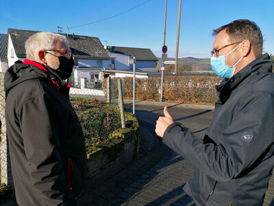„Mich verbindet persönlich eine sehr prägende Zeit mit Kürrenberg und dessen Ortsvorsteher selbst: Ich habe in der heutigen Oberst-Hausschild-Kaserne meinen Wehrdienst unter Spieß Siegmar Stenner abgeleistet. Eine äußerst anstrengende, aber auch sehr lehrreiche Zeit, an die ich mich gerne zurückerinnere“, betonte Landtagskandidat Dr. Alexander Wilhelm (SPD), Staatssekretär, zu Beginn der Ortsbegehung im Mayener Ortsteil Kürrenberg. Der dortige Ortsvorsteher Siegmar Stenner (SPD) und der Landtagskandidat trafen sich vor dem Bürgerhaus, wo Dr. Wilhelm insbesondere den neugestalteten Vorplatz hervorhob.