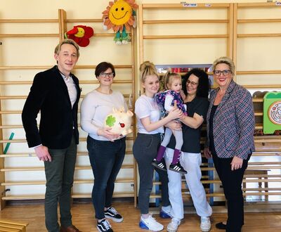 Landtagsabgeordneter Ruland und Staatssekretär Hoch verteilen Präsentkörbe und hören nach